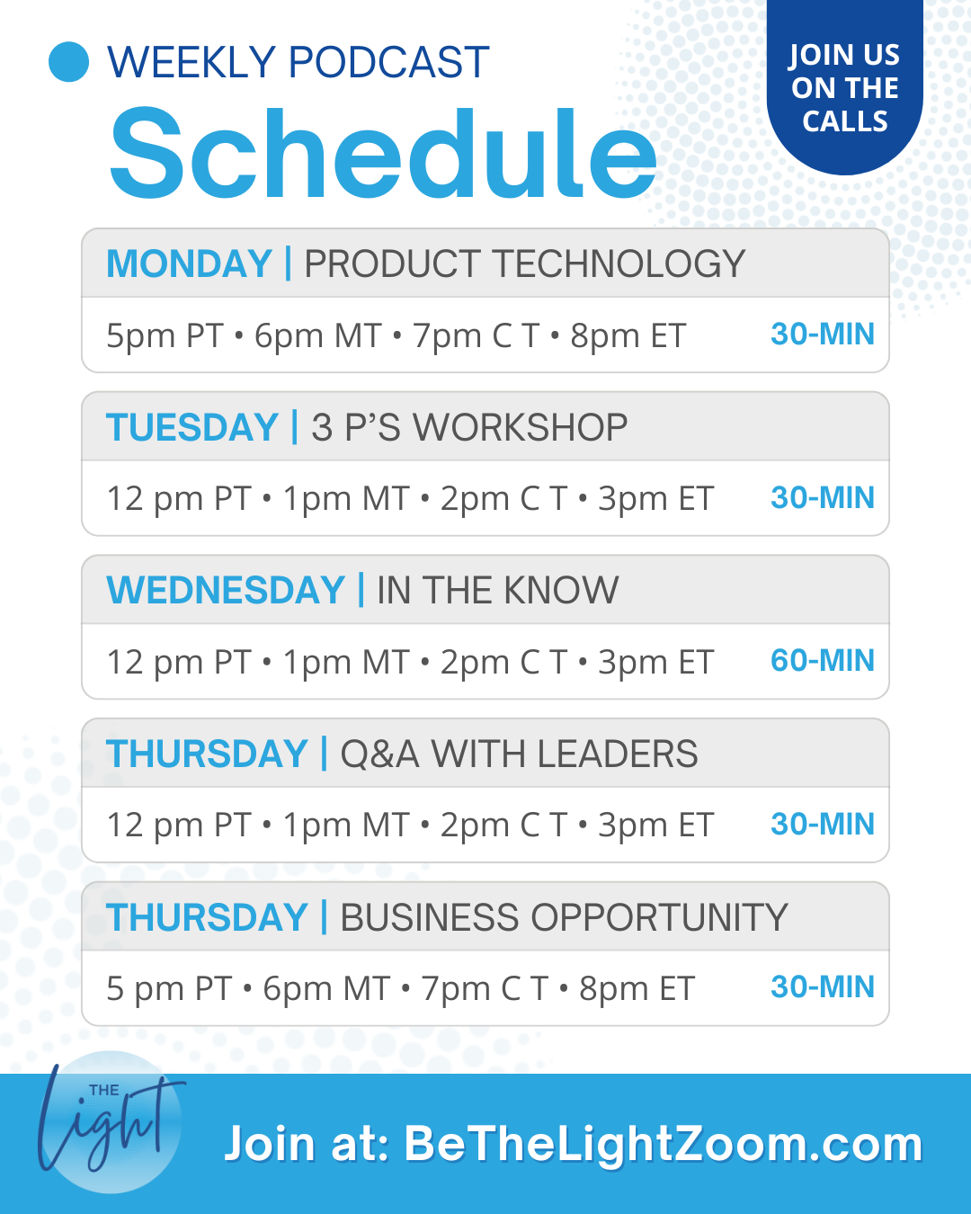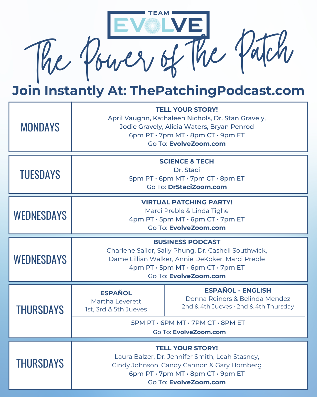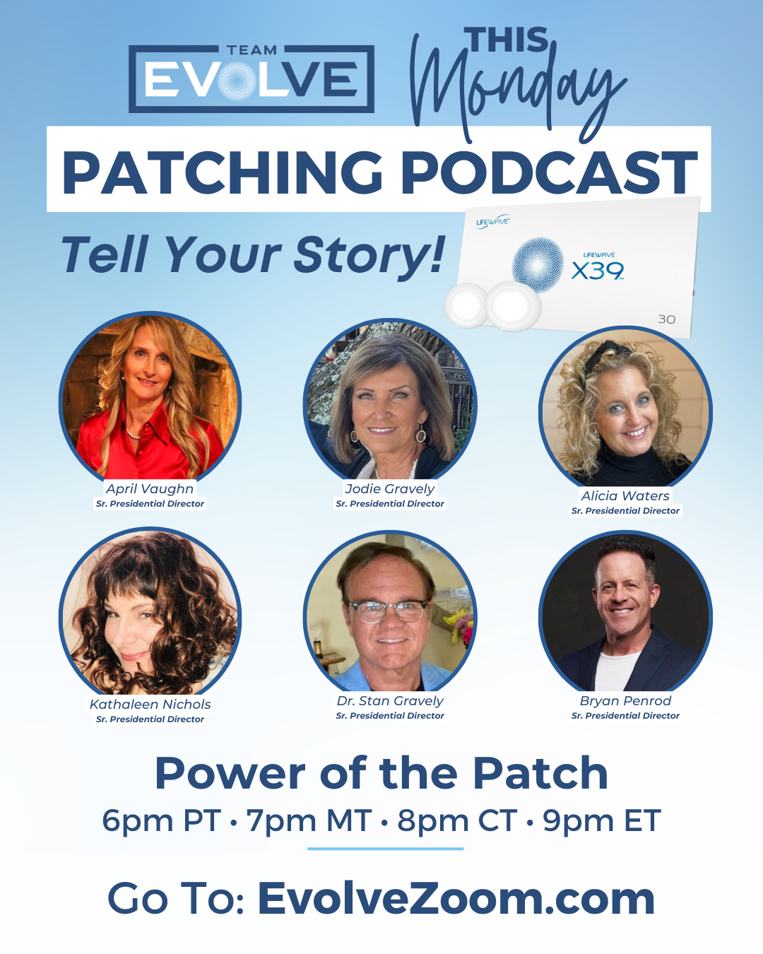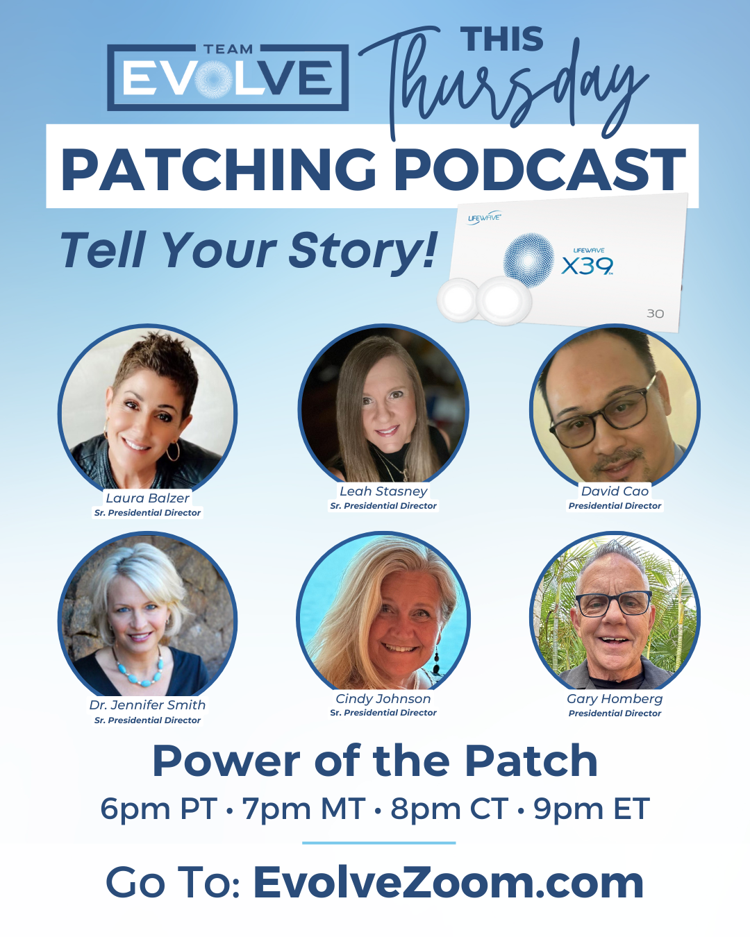 Please join us for our Weekly Patching Podcast During Holidays or Lifewave Corporate Presentations, this schedule is subject to change. Click Image Below to Join the Zoom Podcast MONDAY TUESDAY WEDNESDAY THURSDAY FRIDAY SATURDAY SUNDAY SCHEDULES Learn more about the Power of the Patch!